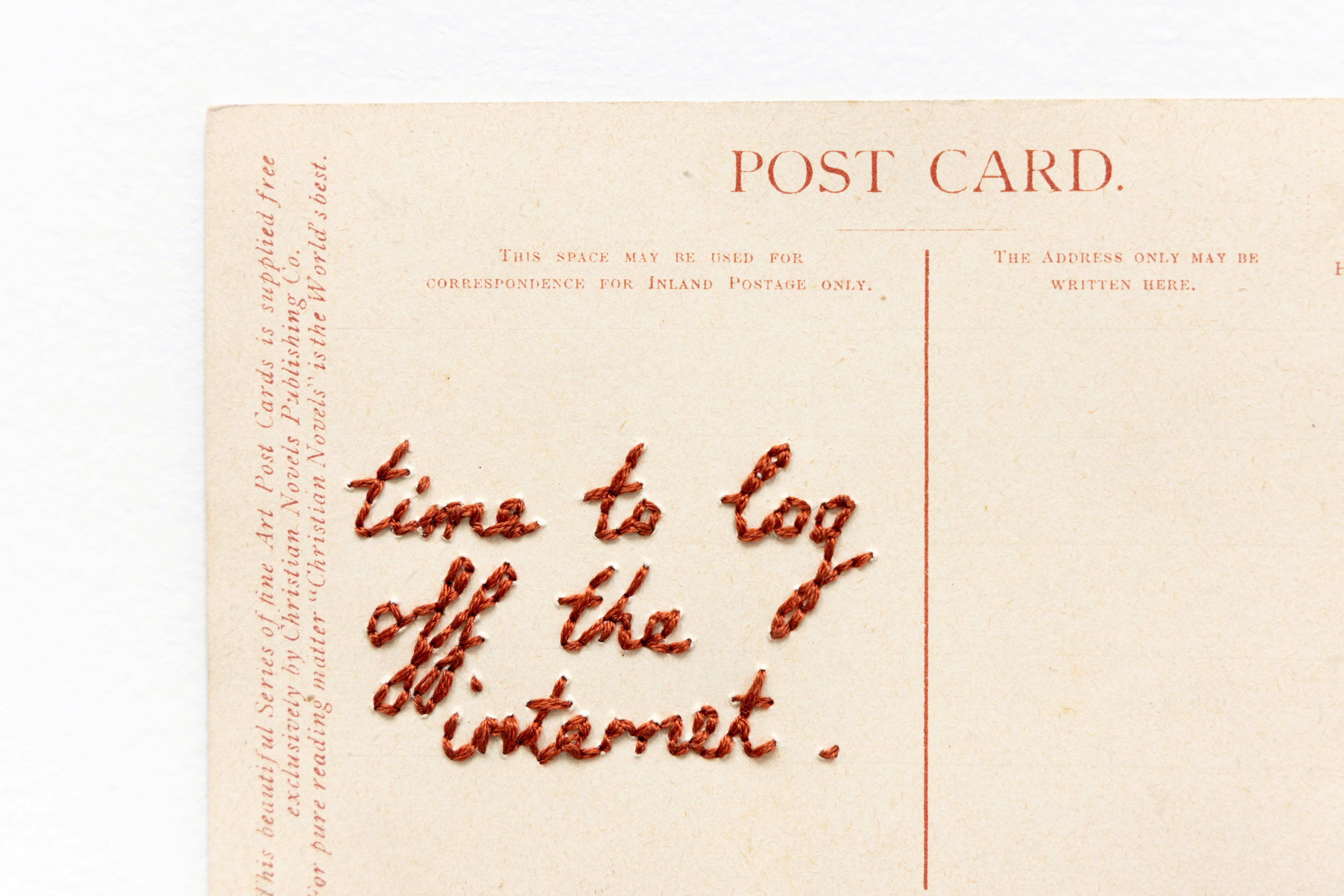 Time to log off the internet Amelia Dowling, time to log off the internet, 2025, hand embroidery on vintage postcard, 10 x 15cm Related